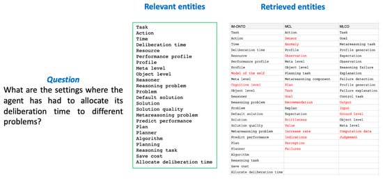 For data-driven evaluation, a corpus in the domain of metareasoning was used. The corpus is a set of answers to questions extracted from five papers that were selected as relevant in the literature review stage but that were not included for the development of the ontology due to the saturation criterion described in Section 3.2.1. For the evaluation, 35 questions were used that covered the information related to the metareasoning problems described in the literature. The questions were manually annotated to extract the main concepts needed to answer them. This is demonstrated in Figure 18. In this figure, a sample question is presented with a list of relevant and retrieved concepts.