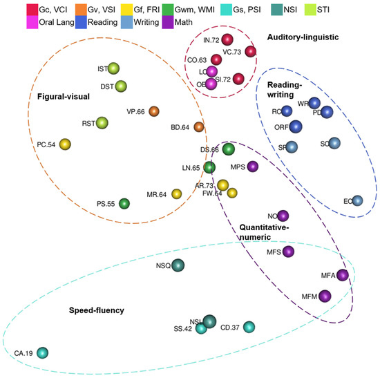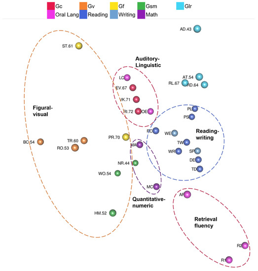 - Auditory-linguistic, figural-visual, reading-writing, quantitative-numeric, and speed-fluency regions were investigated in this study (McGrew et al. 2014). Gc tests, Ga tests, and oral language tests were predicted to cluster together with each other within an auditory-linguistic region. Reading and writing tests were predicted to be located in a reading-writing region. Gf tests were predicted to be in figural-visual or quantitative-numeric regions. Gv tests were predicted to be in a figural-visual region. Gsm or Gwm tests were predicted to be in the region that corresponded to the figural or numeric content (i.e., tests with pictures in the figural-visual region and tests with numbers in the quantitative-numeric region). Glr tests were not expected to be in just one region or in the same region of every configuration (McGrew et al. 2014).