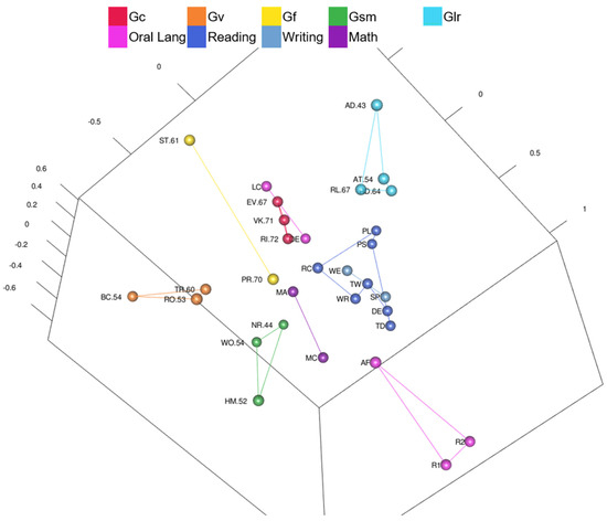 Yes. Kaufman Grades 4–6 CHC ability and academic domain clusters are visible in in Figure 5 (Figure 5 is also available as an interactive 3D graphic in the Supplemental Figures). Tests are color-coded by CHC ability or academic achievement domain, and lines connect the clusters of tests. The writing cluster is inside of the reading cluster. The reading-writing cluster is near math academic achievement tests. Oral language tests are split into two clusters on either side of academic achievement test clusters. Oral Expression and Listening Comprehension are next to the Gc cluster. Naming Facility and Associational Fluency are on the other side of the MDS map. Math Concepts & Applications is closer to Gf tests, but Math Computation is not closer to Gf tests than are the reading tests. Most reading tests, except Reading Comprehension, are farther from Gc than Math Concepts & Applications.