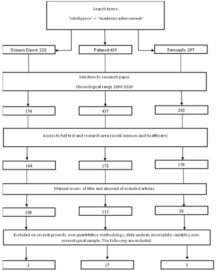 The search strategy was carried out using the criteria of Botella and Gambara (2002), Ausina and Sánchez-Meca (2015) and PRISMA (2015). Three databases were used: Psycoinfo, Pubmed and Science Direct, and research was performed in February 2021. The Boleean action was “academic achievement” and “intelligence” in the range 2000–2020.
