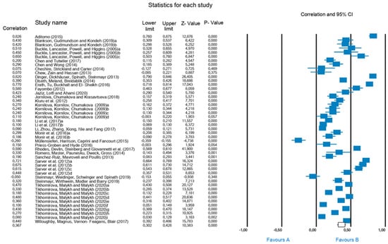 Figure 2 (forest plot) shows the effect size with a 99% confidence interval (0.302–0.428, p = 0.001) for the different studies, the effect size being r = 0.367, p = 0.001. In other words, a moderate level of correlation is obtained according to Cohen between the intelligence presented by the students and academic performance. The ethical criteria set out by Moreau and Gamble (2020) are followed when exposing all the conversions, opting for a policy of “open materials”.