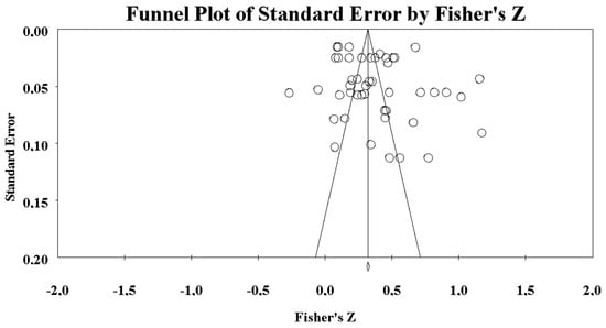 The diversity shown in the Q and I2 statistics could be a sign of extreme data; however, the tight confidence interval (0.302–0.428, p = 0.001) limits this heterogeneity. These results are consistent with the Funnel Plot graph (Figure 3) where the variability and heterogeneity of the sample are reaffirmed. This situation reiterates the diversity of studies, as concluded by the Egger test, without any bias effect. However, it should be noted that the apparent variability could be affected by the transformation to Fisher Z-values since x-values >0.5 tend to be more distorted on the T-Student curve than, in comparison, on the normal curve, although this transformation is accepted by the scientific community for meta-analysis methodology (Martín-Andrés and Luna del Castillo 2004).