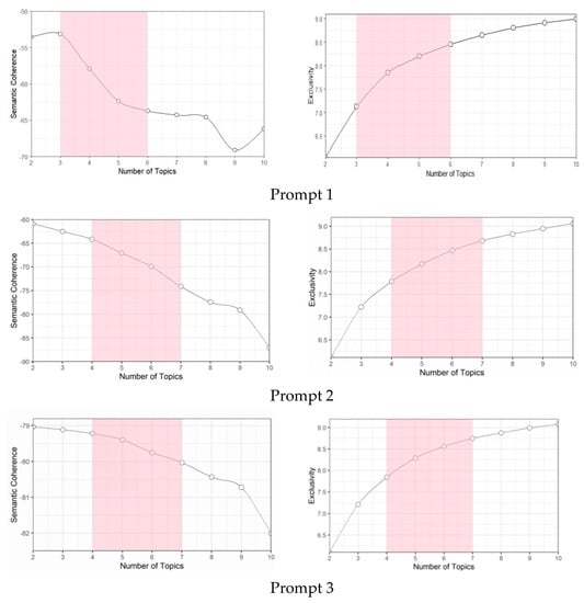 Optimal topic selection. A set of the number of topics is displayed according to two semantic coherence and exclusive diagnostic statistics. The shaded rectangle displays the range in which topics were evaluated for substantive meaning.