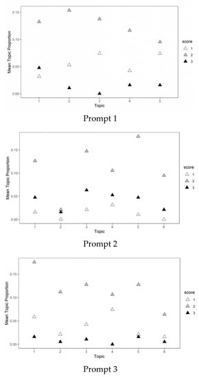 Topic proportions over scores. The horizontal axis represents the topics in a given prompt; the corresponding labels of topics are included in Table 2.