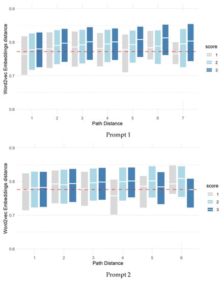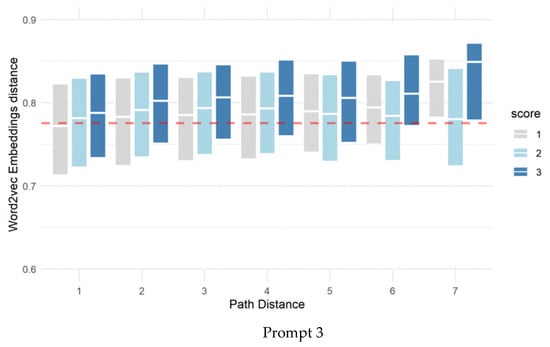 Three random Prompt 1 essays with different human scoring of originality (a one-point and two-point essay from Topic 2, and a three-point essay from Topic 5) were used as examples. These three essays all contained the high-frequency words “parents” and “gift.” Figure 4 illustrated the semantic distance and path distance of the three essays. It shows that the semantic distance of the three-point essay with a path distance of two was higher than the one-point essay, but the difference between the semantic distance of the three-point essay and the two-point essay was not very clear.