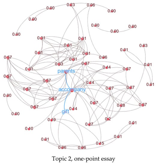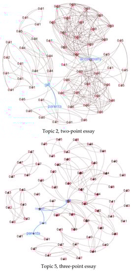 In particular, based on the different contexts in which the essay is compared, we calculated two features of network similarities: One is the correlation between the essay and other essays for a given topic (topicgcor); the second is the network correlation between the essay and all other essays for a given writing task (taskgcor). The calculation method of topicgcor and taskgcor is similar to the “association correlation networks” proposed in (), i.e., Pearson’s correlations between the two word association profiles represented by two matrices.