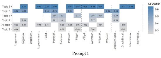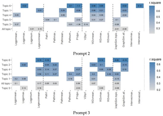 Using network-based features as predictors, lasso regression was performed on each topic and writing task separately. We chose the lambda value that minimizes the mean-squared error to model; therefore, the independent variables were selected according to their importance and considering the collinearity between them. The results showed that for the task-level model, the total variance of the three task models was between 19.7% and 27.1%, and the variance of most topic-level models is higher than the corresponding task-level models. The total variance of the topic-level models in Prompt 1, Prompt 2, and Prompt 3 was between 24.9% and 64.1%, 29.7% and 68.6%, and 18.8% and 63.5%, respectively. The results of each task-level model and topic-level model are presented in Table 3.
