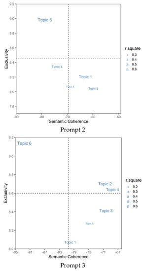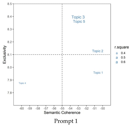 The diagnostic indicators of the model provide general guidance for the selection of the model but do not directly reflect the substantive meaning of the topic identified by the model. To evaluate the meaning of topics, three experts, who participated in the scoring, further reviewed the content validity of the topics generated by all the candidate models. Specifically, the experts assigned substantive labels to each topic by reviewing the high-frequency words for each topic. They independently evaluated the substantive meaning of various topic model solutions and then reached a final consensus through discussion. In this process, some high-frequency words appeared in more than one topic. For example, in Prompt 1, the word “companion” was a high-frequency topic word that provides less information to distinguish the thematic meaning. To provide more information for the representation of topics, we also provided high-frequency exclusive words () for experts as additional references. Finally, the topic solutions of the three writing prompts were determined by experts. The optimal model for Prompt 1 was five topics (coherence = −59.546, exclusion = 8.182); Prompt 2 was six topics (coherence = −62.390, exclusion = 8.197), and Prompt 3 was six topics (coherence = −79.753, exclusion = 8.560). When adopting the optimal model, each topic had substantive meaning and generated the latent topic structure for each essay. Table 2 lists the substantive description of each topic and the proportion of essays with the highest topic probability.