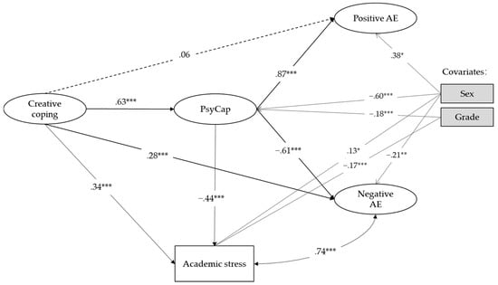Results of the SEM model. Note: N = 780. Standardized parameter estimates are shown. AE = Achievement emotions. Sex and grade were set as control variables. * p < .05, ** p < .01, *** p < .001. The dashed line means insignificant.