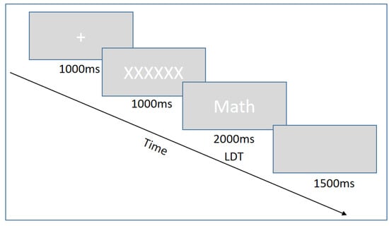 The task was divided into four blocks. Each block contained 10 math-related words, 10 neutral words, 10 words with negative valence, and 30 pseudowords (i.e., 60 stimuli per block). At the beginning of each block, instructions were displayed asking participants to read the words silently (without pronouncing them) and then, after a fixation screen had replaced the stimulus, to press the left mouse button for ‘word’ or the right mouse button for ‘nonword’ for each textual stimulus displayed on the computer screen. This type of task is called a lexical decision task (LDT).