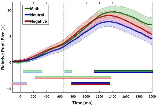Relative Changes in Pupil Size for Three Conditions from Stimulus Onset (Time 0; black, dashed vertical line) to Trial Onset. Each colored, dashed vertical line marks the mean response time to the LDT task for the given condition. For each condition, the line curves represent changes in pupil dilation as a function of time. The shaded areas depict standard errors of the mean. The dark horizontal lines represent meaningful comparisons (BF10 > 3) for each contrast (e.g., the top green and blue lines indicate meaningful differences in pupil response to math-related words and words with neutral valence). The bright horizontal lines represent meaningful similarities (BF10 < ) for each contrast (evidence of the null hypothesis).
