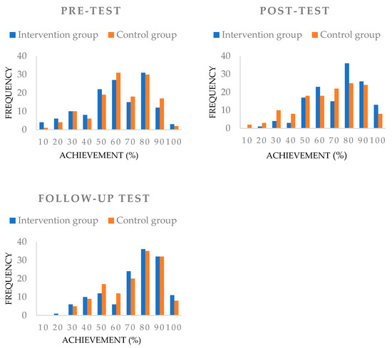 Frequency distribution of intervention and control group performance at three times: (1) pretest: before intervention; (2) post-test: after intervention; and (3) follow-up test: three months after intervention.