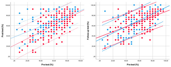 The relationship between students’ performance on the pre- and post-tests and on the pre- and follow-up tests is illustrated in Figure 3. The first figure shows the power of change between the pre- and post-tests, and the second figure demonstrates the power of change between the pre- and follow-up tests. The abscissa indicates the performance on the pretest, while the ordinate represents the performance on the post- or follow-up test. Each dot in the figure symbolizes a student. The blue color stands for the intervention group, and the red color signifies the control group. Students whose symbols fall on the mean line or between the two dashed lines (representing a standard deviation) performed equally in both cases. If the symbol is above the dashed line, it means that the student has shown a significant improvement from the pre- to the post-test or from the pre- to the follow-up test, while if it is below the dashed line, the student performance was significantly worse from the first to the second and from the first to the third data collection.