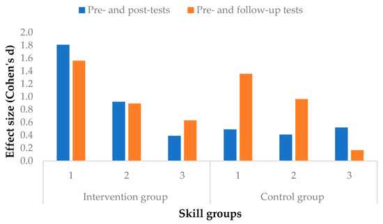 Performance of students in the intervention and control groups according to the three skill groups on the pre-, post-, and follow-up tests.