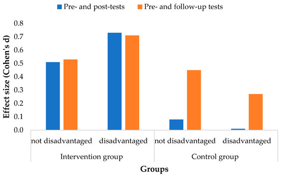 As one of the priorities of school education is to bridge the gap experienced by socioeconomically disadvantaged students, we were interested in the extent of the developmental impact of the intervention program on them. Disadvantaged students are students who experience normal school conditions, who receive regular family services support because of their parents’ low educational attainment and/or under- or unemployment, and/or whose living or housing conditions are inadequate. The performance of the students in the intervention and control groups according to the three skill groups on the pre-, post-, and follow-up tests with respect to disadvantage is shown in Table 4. In terms of disadvantage, the distribution of students was similar in the intervention and control groups. The performance measured on the pretest was lower in both groups in the intervention group, and the results obtained on the post-test show higher values compared to the same subgroups in the control group. The magnitude of the effect of the experimental intervention is illustrated in Figure 5.