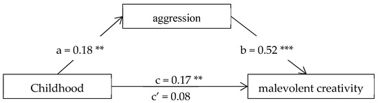 The mediation role of aggression between childhood trauma and malevolent creativity. Note. The mediation model was adjusted for the effects of gender, age, place of birth, and only child status. The letters a, b, c and c’ denote standardized regression coefficients: c = total effect of childhood trauma on malevolent creativity; c’ = direct effect of childhood trauma on malevolent creativity. ** p < 0.01, *** p < 0.001.