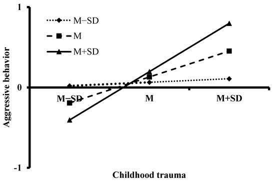 Additionally, the simple slope analysis was performed to test the interaction and explore whether the slopes for participants with stronger psychological resilience were different from that for the participants with weaker psychological resilience. The results are shown in Figure 3. The effect of childhood trauma on aggression was stronger for participants with higher (M + 1SD) psychological resilience (β = 0.60, t = 7.59, p < 0.001, 95% CI [0.446, 0.757]) than that for participants with medium (M) psychological resilience (β = 0.32, t = 5.76, p < 0.001, 95% CI [0.213, 0.433]) and lower (M − 1SD) psychological resilience (β = 0.04, t = 0.68, p = 0.495, 95% CI [−0.083, 0.172]). That is to say, the aggressive behaviors of college students with high and medium levels of psychological resilience were more likely to be affected by childhood trauma than that of college students with a low level of psychological resilience. Meanwhile, resilience buffered the negative roles of low-level childhood trauma on aggression but magnified the negative effects of high-level childhood trauma.