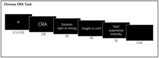 In the solution phase (Figure 1), for each trial, a fixation “+” was presented in the middle of the screen for 300 to 500 ms first. Moreover, 300 to 500 ms temporal jitters were used before the stimulus presentation. After that, the CRA was presented for 10 s and allowed to be solved by participants. Participants were required to press the space key immediately once they obtained the solution. Then, the screen showed the correct solution for 3 s, which allowed the participants to honestly judge whether their solution was correct. The participants pressed the “f” key if their solution was correct and the “j” key if their solution was incorrect. If the participant did not solve the problem within 10 s, the screen still showed the solution, which allowed participants to watch for 3 s. Finally, participants needed to report whether they had an Aha experience (“f” key: Aha; “j” key: no Aha) within 4 s, and they also rated the Aha experience intensity (a 5-point scale was used) for 3 s. There were 160 items in the solution phase, and participants were allowed to rest every time they completed 40 items.