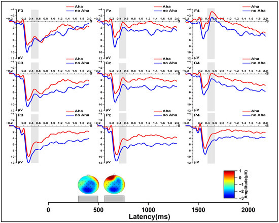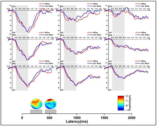 In the early re-solution phase for the Aha and no Aha conditions, as shown in Figure 5, at 250~300 ms, the results revealed a significant main effect of solution type, F (1, 24) = 5.784, p < 0.05, ηp2 = 0.194, a significant main effect of region, F (2, 48) = 8.504, p < 0.01, ηp2 = 0.262, and a significant main effect of laterality, F (2, 48) = 14.153, p < 0.001, ηp2 = 0.371. At 300 to 350 ms, a marginally significant main effect of solution type was observed, F (1, 24) = 3.646, p = 0.068, ηp2 = 0.132, and a significant main effect of laterality was observed, F (2, 48) = 13.934, p < 0.001, ηp2 = 0.367. Further simple effect analysis showed that the Aha condition evoked a larger P300 amplitude than the no Aha condition at 250 to 350 ms, p < 0.05; p = 0.068. Significant effects were found in the two-dimensional interaction between region and laterality, F (4, 96) = 2.595, p = 0.068, ηp2 = 0.098. At 400 to 500 ms, we found a significant main effect of laterality, F (2, 48) = 16.320, p < 0.001, ηp2 = 0.405. In addition, a significant effect was also found in the two-dimensional interaction between region and laterality, F (4, 96) = 5.343, p < 0.01, ηp2 = 0.182. A similar result was observed at 500 to 600 ms. In the 600~700 ms and 700~800 ms time windows, we found a significant main effect of region, F (2, 48) = 4.183, p = 0.042, ηp2 = 0.148; F (2, 48) = 5.345, p = 0.021, ηp2 = 0.182, a significant main effect of laterality, F (2, 48) = 28.375, p < 0.001, ηp2 = 0.542; F (2, 48) = 31.001, p < 0.001, ηp2 = 0.564, and a significant interaction effect of laterality × region, F (4, 96) = 13.608, p < 0.001, ηp2 = 0.362; F (4, 96) = 19.151, p < 0.001, ηp2 = 0.444.