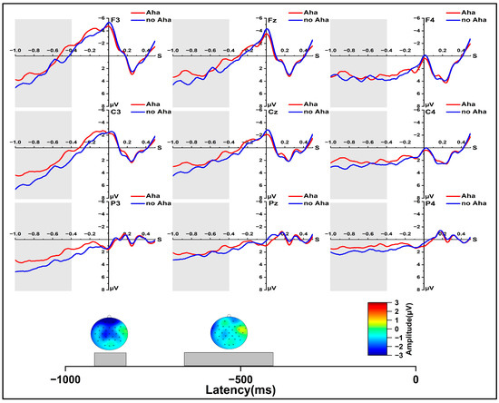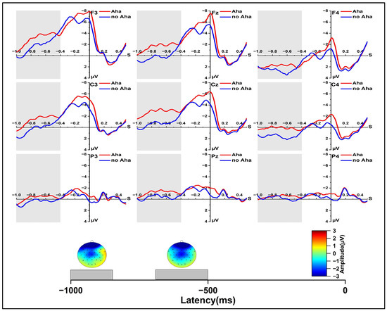 In the late solution phase (Figure 3), for the −500 to −400 ms time window, the repeated measures ANOVA showed a significant main effect for laterality, F (2, 48) = 14.022, p < 0.001, ηp2 = 0.369, and a significant interaction of laterality and region, F (4, 96) = 30.500, p < 0.001, ηp2 = 0.560. At −700 to −500 ms, the repeated measures ANOVA showed significant main effects for solution type, F (1, 24) = 4.347, p < 0.05, ηp2 = 0.153, and for laterality, F (2, 48) = 11.925, p < 0.001, ηp2 = 0.332. A more negative wave for the Aha condition than the no Aha condition was found, p < 0.05. There was a significant interaction of laterality and region, F (4, 96) = 28.829, p < 0.001, ηp2 = 0.546. At −1000 to −700 ms, and a significant main effect of laterality was found, F (2, 48) = 5.091, p < 0.05, ηp2 = 0.175. Significant effects were also found in the two-dimensional interaction between solution type and region, as well as laterality and region, F (2, 48) = 3.59, p < 0.05, ηp2 = 0.130; F (4, 96) = 18.134, p < 0.001, ηp2 = 0.430. Further simple effect analysis showed that, compared with the no Aha condition, the Aha condition evoked a more negative ERP in the central region, p < 0.05.