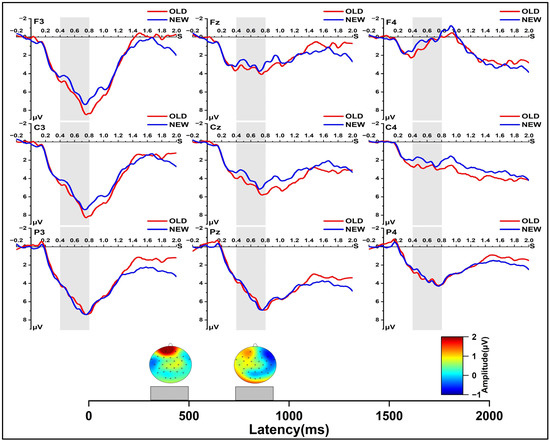 In the early re-solution phase for the old and new conditions (Figure 4), at 400~500 ms, we found a significant main effect of solution type, F (1, 24) = 5.131, p < 0.05, ηp2 = 0.176, and a significant main effect of laterality, F (2, 48) = 24.679, p < 0.001, ηp2 = 0.507. Further pairwise comparison indicated that old items resulted in a significantly higher positive wave than the new items, p < 0.05. There was an interaction of laterality and region, F (4, 96) = 4.873, p < 0.01, ηp2 = 0.169. At 500~600 ms, we found a significant main effect of laterality, F (2, 48) = 27.647, p < 0.001, ηp2 = 0.535, and a significant main effect of region, F (2, 48) = 4.444, p < 0.05, ηp2 = 0.156. We also found a marginally significant interaction effect between solution type and region, F (2, 48) = 3.410, p = 0.059, ηp2 = 0.124, and a significant interaction effect between region and laterality, F (2, 48) = 7.785, p = 0.001, ηp2 = 0.245. Further simple effect analysis showed that in the central region, old items resulted in a significantly higher positive wave than the new items, p < 0.05. At 600~700 ms, we found a significant main effect of laterality, F (2, 48) = 33.298, p < 0.001, ηp2 = 0.581, and a significant main effect of region, F (2, 48) = 6.928, p < 0.01, ηp2 = 0.224. In addition, we found a marginally significant solution type × region interaction effect, F (2, 48) = 3.190, p = 0.068, ηp2 = 0.117, and a significant region × laterality interaction effect, F (4, 96) = 12.409, p < 0.001, ηp2 = 0.341. At 700~800 ms, we found a significant main effect of laterality, F (2, 48) = 34.324, p < 0.001, ηp2 = 0.589, and a significant main effect of region, F (2, 48) = 8.189, p < 0.01, ηp2 = 0.254. We found a marginally significant solution type × region interaction effect, F (2, 48) = 3.184, p = 0.068, ηp2 = 0.117, and a significant region × laterality interaction effect, F (4, 96) = 18.259, p < 0.001, ηp2 = 0.432. In the central region, old items resulted in a significantly higher positive wave than the new items, p < 0.05.