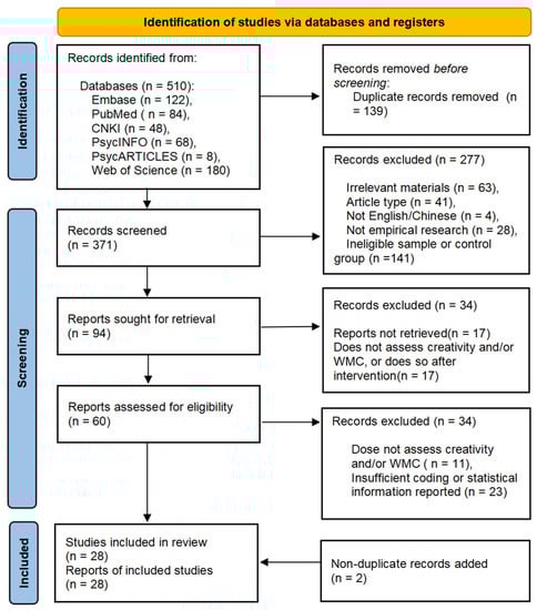 Therefore, the current study aimed to provide evidence to clarify the association between WMC and creativity. We conducted a meta-analysis with a random-effects model to pool the individual effect size from each study concerning the association between WMC and creativity. The systematic retrieval of the literature was conducted by following 2020 PRISMA pipeline in PsycINFO, Web of Science, PubMed, EMBASE, CNKI (Chinese database) and PsycARTICLES datasets on 17 June 2022. Further, to probe into the potential hierarchical factors affecting this association, we conducted an exploratory, subgroup meta-analysis by dividing comprehensive WMC into verbal WMC, visual–spatial WMC and dual-task coordination WMC. Finally, to further probe into the impact of potential confounding factors for the meta-analytic effects, we conducted a moderation analysis to examine whether the association between WMC and creativity is moderated by cultural background and age group.