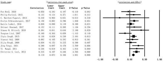 Likewise, the heterogeneity test was conducted beforehand. Results showed a high heterogeneity for this subgroup meta-analytic model (I2 = 39%, p = .069). Thus, the meta-analysis, using the random-effects model for investigating the association between verbal WMC and creativity, revealed that the meta-analytic effect for the positive correlation between verbal WMC and creativity reached statistical significance (r = .119, 95% CI: .072–.166, SE = .006, p < .001, n = 1733) (see Figure 3).