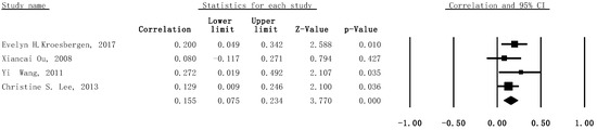 Heterogeneity was found to be acceptable for the included studies in the subgroup meta-analytic analysis (I2 = 0%, p = .58). Thus, the fix-effect model for meta-analysis was built; this demonstrated the statistically significant correlation between WMC and creativity (r = .155, 95% CI: .075–.234, SE = .006, p < .001, n = 592) (see Figure 4).
