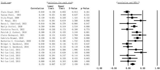 Here, a total of twenty-eight papers (k = 28, the number of r statistics = 75, n = 3104) were screened and deemed eligible for generating the final data pool in the following meta-analysis. Fundamental information for all the included studies is tabulated in Table 1.
