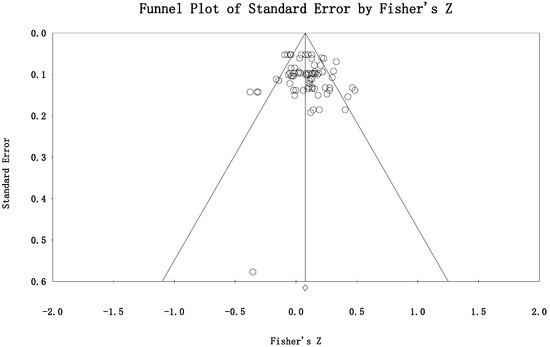 A funnel plot for standard Fisher-Z scores for the included studies can be used to explore the publication bias. The scattered points showed a symmetric distribution (see Figure 6), which indicated no perceived publication bias. To quantify the risk of publication bias, the Egger’s test was conducted. Results showed no prominent publication bias (e = .449, p = .350). Finally, the evidence quality for the included studies was validated to be acceptable (mean scores for mNOS = 4.65, SD = 0.56, Median = 5).