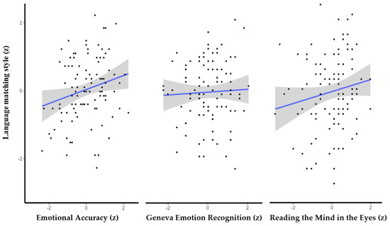 The simple correlation between language style matching and accurate emotion recognition on the EAT (left) and the GERT (middle), and the RMET (right). Note. Grey denotes 95% confidence intervals.