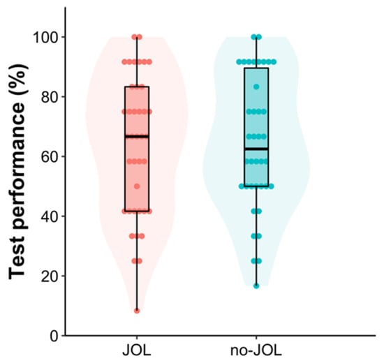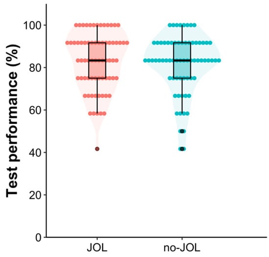 A pre-planned one-tailed Bayesian independent t-test was performed on final test performance,1 which showed that there was no statistically detectable difference in final test performance between the JOL (M = 82.85, SD = 13.70) and no-JOL (M = 81.50, SD = 14.10) groups, difference = 1.36 [−3.34, 6.05]2, t(135) = 0.57, p = .29, Cohen’s d = 0.10 [−0.24, 0.43], BF10 = 0.30 (see Figure 1), suggesting that making JOLs following retrieval practice does not reactively facilitate text learning. This finding is inconsistent with that observed in Ariel et al.’s (2021) Experiment 4.