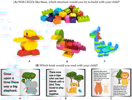 The measure of learning activity choice was designed to measure the level of challenge that participants intended for their children when engaging in spatial and literacy learning activities, and it served as our primary outcome of interest. Participants were presented with six spatial and six literacy activities. For each activity, they were asked to choose what they would do with their child from three options that varied in difficulty (for all items, see Supplementary Materials, Section E). The criterion we used to determine difficulty depends on the activity. For example, one spatial question showed a pile of LEGO blocks and asked, “With LEGOs like these, which structure would you try to build with your child?” The three choices were LEGO structures that varied in the number of blocks needed, ranging from easy to hard (Figure 1A). One literacy question asked, “Which book would you read with your child?” The three choices were illustrations of the inside of made-up children’s story books that varied in the number of words and number of characters involved in the story (Figure 1B). See Supplementary Materials, Section F for the criteria we used to determine difficulty for each activity. The order of the three choices was randomized for each question. We coded choices with numeric values, with 1 = easy, 2 = medium, and 3 = hard. Internal consistency of the scale was good for spatial items ( = 0.77) and moderate for literacy items ( = 0.65). Composite scores were separately calculated for spatial and literacy items by averaging responses to items in the corresponding domain.