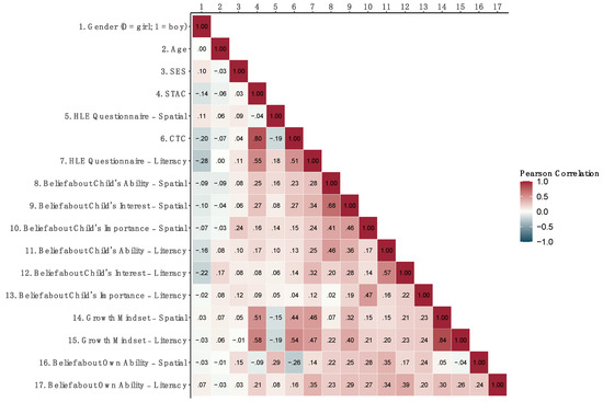 Figure 2 shows correlations among all demographic characteristics and pre-induction measures. The only pre-induction measures that differed by gender were the CTC, the literacy HLE questionnaire, and participants’ beliefs about children’s literacy interest. Parents of girls provided richer literacy HLE and believed that their children were more interested in literacy activities than parents of boys.