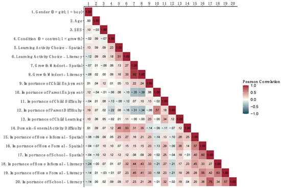 All participants received the measures in the same order: HLE checklist, HLE questionnaire, motivational beliefs about child, beliefs about own ability, growth mindset, reading an article on growth mindset or a control article about déjà vu, learning activity choice, learning activity considerations, and growth mindset. On the learning-activity-choice measure, spatial and literacy questions were combined in the same questionnaire. Participants received this learning-activity-choice questionnaire in one of two pseudo-random orders, with the constraint that no more than two consecutive questions concerned activities in the same domain. On all other measures that had both spatial and literacy questionnaires, half of the participants received literacy questionnaires first, and the other half received spatial questionnaires first. Finally, participants completed a demographic questionnaire. Participants completed the study on Qualtrics. All study questionnaires are presented in the Supplementary Materials (Sections B–E).
