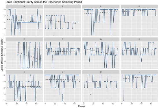 Levels of State Emotional Clarity across a Two-Week Experience Sampling period. Each panel (A–L) shows one participant’s levels of state emotional clarity reported during two weeks of experience sampling. Each dot represents an experience sampling prompt. Dotted lines represent lines of best fit for that participant’s levels of emotional clarity as a function of time. Across participants, consistent time effects do not emerge as a result of reporting emotional clarity during an experience sampling study.