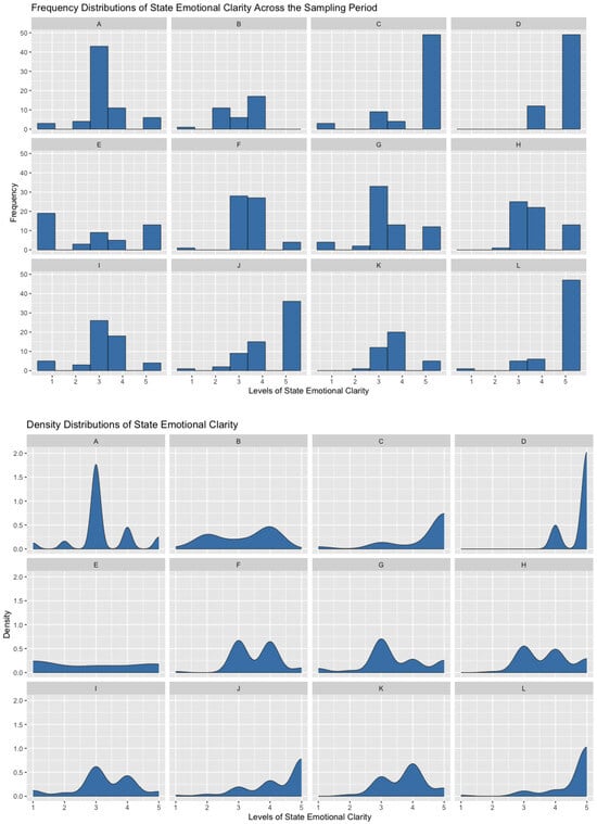 Frequency (top) and Density (bottom) Distributions of State Emotional Clarity across Two Weeks of Experience Sampling. Each panel (A–L) shows one participant’s frequency (top) and density (bottom) distributions of state emotional clarity reported during two weeks of experience sampling. Participants vary in the shape, center, and spread of reported levels of state emotional clarity across a two-week period. The same participants are shown in the top and bottom panel plots (e.g., Participant A’s frequency distribution is shown at the top and their density distribution is shown at the bottom).