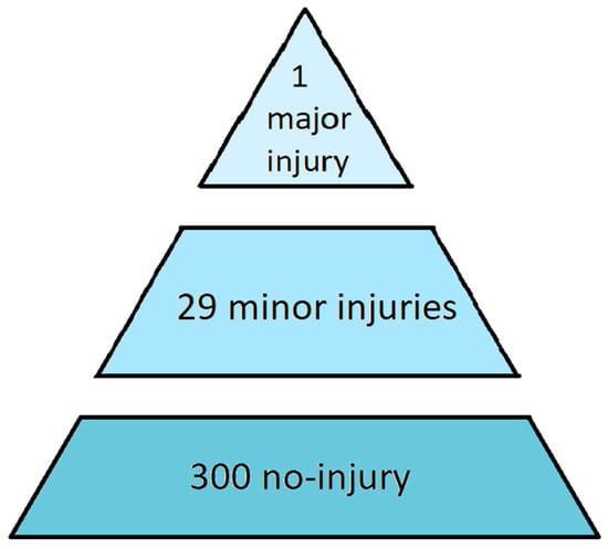 Sequential models have been developed to explain accidents as a series of events, offering tools for managers and researchers to identify factors leading to failures (Woods et al. 2010; Swuste et al. 2014). One of the earliest models to elucidate the precursors of accidents is Heinrich’s pyramid. Heinrich (1941) proposed that accidents occur as a result of preceding events, such as near misses or unsafe acts. These events are metaphorically represented as layers of a pyramid, with the actual injury at the pinnacle. Heinrich’s original work in the 1930s aimed to establish statistical relationships between major injuries and other critical safety events, based on data from the insurance industry. According to Heinrich (1941), the ratios of near misses (i.e., no-injury accidents), minor injuries, and major injuries would result in a triangular shape (300:29:1) (Figure 1).