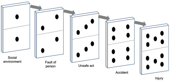 The domino model was the first accident analysis technique used for prevention (Swuste et al. 2014). It illustrates the sequence of accidents from the initial cause (the first domino) to the actual failure (the latest domino) (Marsden 2017). When the first domino falls, it triggers the fall of the second, then of the third, and so on, with the injury being the final domino to fall. In Heinrich’s graphical representation, each tile represents an organizational element (Figure 2).