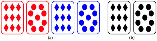 Examples of visual stimuli in Experiment 1. (a) The red and blue pictures were stimuli for the visual modality. (b) The black-and-white pictures were stimuli for the audiovisual modality.