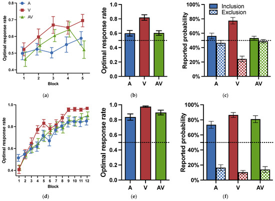 Optimal response rates and reported probabilities for Experiment 1. (a) Optimal response rates for the training phase in Experiment 1a. 1 block = 24 trials; (b) optimal response rates for the testing phase in Experiment 1a; (c) reported probability of cue combinations in Experiment 1a; (d) optimal response rates for the training phase in Exp. 1b. 1 block = 30 trials; (e) optimal response rates for the testing phase in Experiment 1b; (f) reported probability of cue combinations in Experiment 1b. A: audio modality; V: visual modality; AV: audiovisual modality. Error bars reflect standard errors.