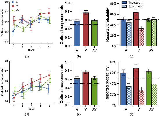 The optimal response rates for each block in Experiment 2b are shown in Figure 5d. A two-way repeated ANOVA for modality (visual, auditory, audiovisual) by block (1–5) was conducted to examine if the learning effect was influenced by the cue modality during the training phase. It revealed that the main effects of block were significant: F (4, 92) = 5.520, p < .001, = 0.194, proving a learning effect. Neither the main effect of the modality, F (2, 46) = 1.852, p = .168, = 0.075, BF = 0.220, nor the interaction between the block and modality, F (8, 184) = 1.057, p = .395, = 0.044, BF = 0.078, reached significance.