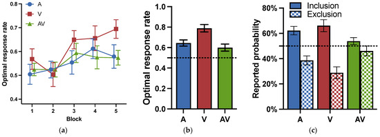 The optimal response rates for each block in the training phase are shown in Figure 5a. A two-way repeated ANOVA for cue modality (visual, auditory, audiovisual) and block (1–5) was conducted to examine whether the learning effect was influenced by the cue modality. It revealed that the main effects of block were significant: F (4, 84) = 3.092, p = .020, = 0.128, indicating a learning effect. Neither the main effect of modality, F (2, 42) = 1.343, p = .272, = 0.060, BF = 0.183, nor the interaction effect between block and modality, F (8, 168) = 0.964, p = .466, = 0.044, BF = 0.068, reached significance.