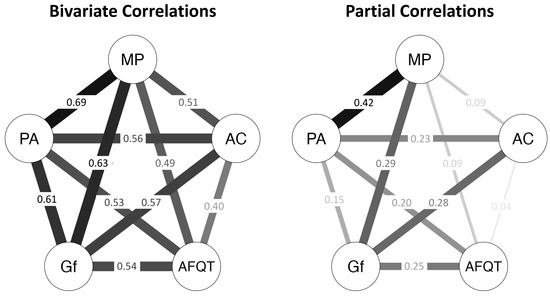 Psychometric network models with composites of observed variables. Values in the left panel are bivariate (Pearson’s) correlations (rs); values in the right panel are partial correlations (prs). AFQT, Armed Services Qualification Test; Gf, Fluid Intelligence; PA, Placekeeping Ability; AC, Attention Control; MP, Multitasking Performance. rs > 0.11 and prs > 0.12 are statistically significant (p < .05).