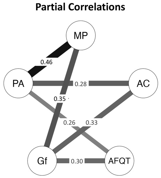 Bayesian psychometric network models with composites of observed variables. Values are partial correlations (prs). Inclusion criterion, BF10 > 3. AFQT, Armed Services Qualification Test; Gf, Fluid Intelligence; PA, Placekeeping Ability; AC, Attention Control; MP, Multitasking Performance.