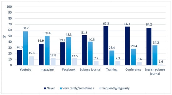 The most popular sources of information about neuroscience and education were YouTube and Hungarian-language magazines (73.8% and 63.2% stated that they used these at least sometimes, respectively), but even these sources were infrequently used by most participants. Only a small fraction of participants stated that they use any sources frequently or regularly (YouTube 15.6%, magazines 12.8%, Facebook 12.5%, scientific journals 7.7%, training 7.3%, conference 5.6%, English language scientific journals 1.6%) (Figure 1).