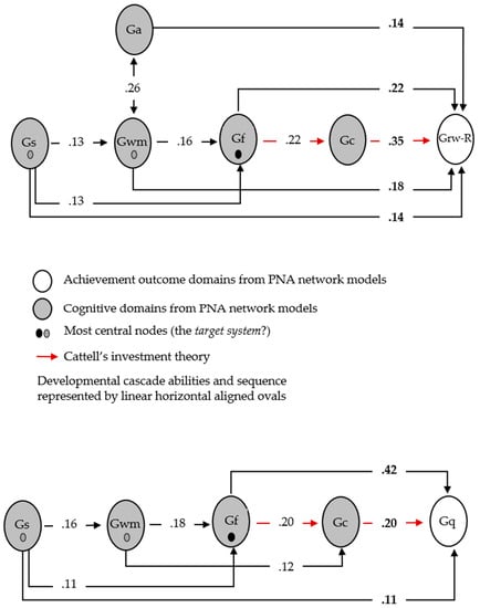 Few, if any, validated theoretical causal mechanisms between and among all major CHC abilities exist in the literature. However, Hajovsky et al. (2022) recently reported, via exploratory meta-structural equation modeling applied to data from multiple cognitive and achievement batteries, how three established theories of cognitive and achievement development (i.e., the developmental cascade theory, Cattell’s investment theory, and an expanded simple view of the reading model) could be applied to a complex interconnected network of CHC constructs and measures. Given that the purpose of the interpretation of Figure 1 and Figure 2 is to demonstrate the potential of Carroll’s higher-stratum design cognitive–achievement PNA models, only the two most recognized theories (i.e., developmental cascade and Cattell’s investment theory) were applied to the two models.