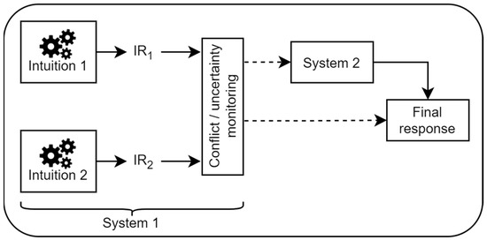 Based on these more recent findings, a common framework is emerging, and the proposed working model is depicted in Figure 1. Intuitive processes generate initial intuitive responses (IR). Depending on task demands, and previous experience, one or more of these responses may be generated. Most tasks in the field are designed to pit a heuristic response against an analytical response. For example, take a simplified version of the Base Rate Neglect task (De Neys and Glumicic 2008; Dujmović and Valerjev 2018). Participants are told that a random person is chosen from a group of 1000 people. The random person is very tall. The group consists of 10 basketball players and 990 mathematicians. The task is to pick whether it is more probable that the randomly chosen person is a basketball player or a mathematician. In this example, one intuitive response is based on height being extremely typical of basketball players compared to mathematicians. Thus, it indicates that the randomly chosen person is most likely a basketball player. The second response is based on the information indicating there are many more mathematicians in the group, and thus indicates that the randomly chosen person is a mathematician.