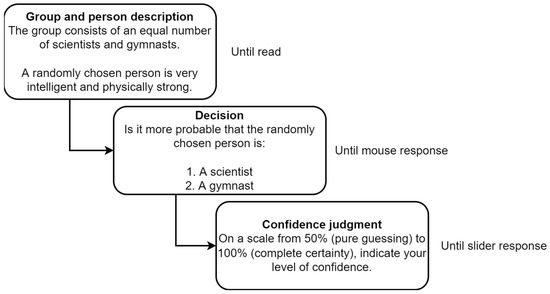 Participants first provided demographic information and were given instruction in the form of a walkthrough of an unused example of the task. They then completed the 16 tasks (a single trial procedure for each task can be seen in Figure 2). The task order was randomized for each participant. The order in which responses appeared was balanced so that in half of the trials, the response according to the dominant heuristic was the first response option, and in half, it was the second option. The experiment was designed in PsychoPy (Peirce et al. 2019) and conducted via the Pavlovia online platform. Participants were required to complete the study on a desktop or laptop computer with a mouse and asked to isolate themselves in a quiet environment during the study.