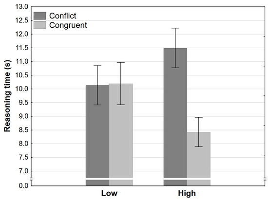 The ANOVA of reasoning times revealed the same pattern of results. Participants were generally faster in the congruent conditions, but this is qualified by a large interaction effect. Participants completed tasks in the low-conflict condition just as fast as in the low-congruence condition but significantly faster in the high-congruence and significantly slower in the high-conflict condition (Figure 4, note that the figure depicts raw response times for convenience, the ANOVA was conducted on logarithms). The implications are the same as for accuracy rates; it seems that final response strength is the key determining factor in how long reasoning is going to take, not whether conflict was present or not.